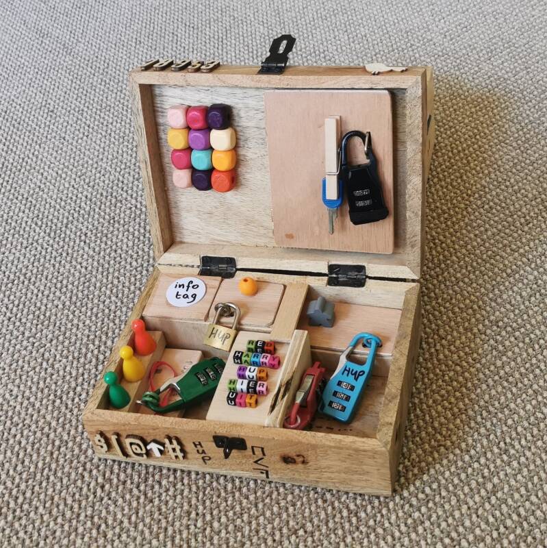 De 8 kistjes zijn van hout gemaakt. Ze bevatten ongeveer dezelfde opdrachten, maar alle codes zijn verschillend.