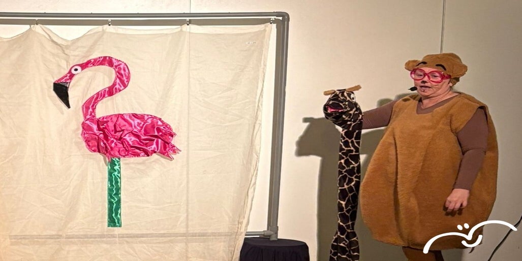Bril? wordt gespeeld door Yvette Vogels van Vrolijke vleugels samen met handpop Giraf in een kleurrijk decor van stof en pvc-buizen.